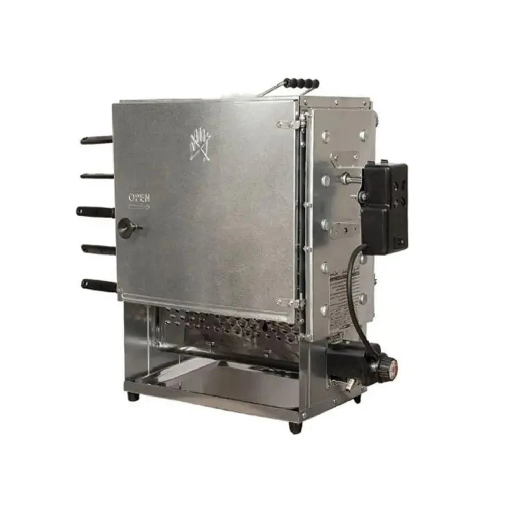 وزن این دستگاه 6.5 کیلوگرم بوده و ارتفاع آن به 43 سانتی متر می رسد. همچنین این کباب پز دارای ارتفاع 43 سانتی متری، طول 44 سانتی متری و ضخامت 26 سانتی متری می باشد. جنس بدنه ی این محصول، از ورق گالوانیزه بوده تا بتواند مقاومت خوبی در برابر حرارت و گرما از خود نشان دهد. همچنین این ورق، دچار زنگ زدگی و خوردگی نمی شود و در برابر ضربه نیز از استحکام بالایی برخوردار است. طراحی این محصول به گونه ای می باشد که امکان استفاده ی دو طرفه از این سازه امکان پذیر باشد و به دلیل داشتن درب، انرژی کمی را مصرف می کند. از طرف دیگر، همان طور که پیش تر به آن اشاره شد، این دستگاه هیچ دودی تولید نمی کند زیرا روغن به هیچ عنوان بر روی شعله ریخته نمی شود. به بیانی دیگر، همراه با این دستگاه، یک سینی عصاره جمع کن کباب ها برای کاربر ارسال می شود تا از ریخته شدن روغن بر روی شعله جلوگیری شود. در واقع با این محصول، لوازم جانبی بسیاری همراه با آن ارسال می گردد و به همین دلیل محصول مقرون به صرفه ای به شمار می رود.