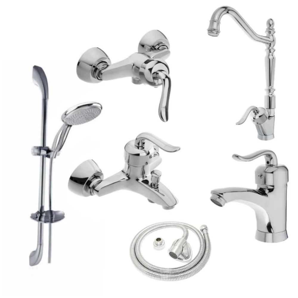 ست شش تیکه شیرآلات قاجاری کروم به همراه علم دوش و شیلنگ توالت