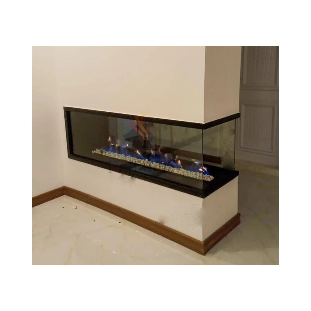 شومینه گازی دو طرفه شکل ظاهری به صورت ال جنس بدنه از فریم بدنه مشکی دارای گارانتی اصلی شرکت