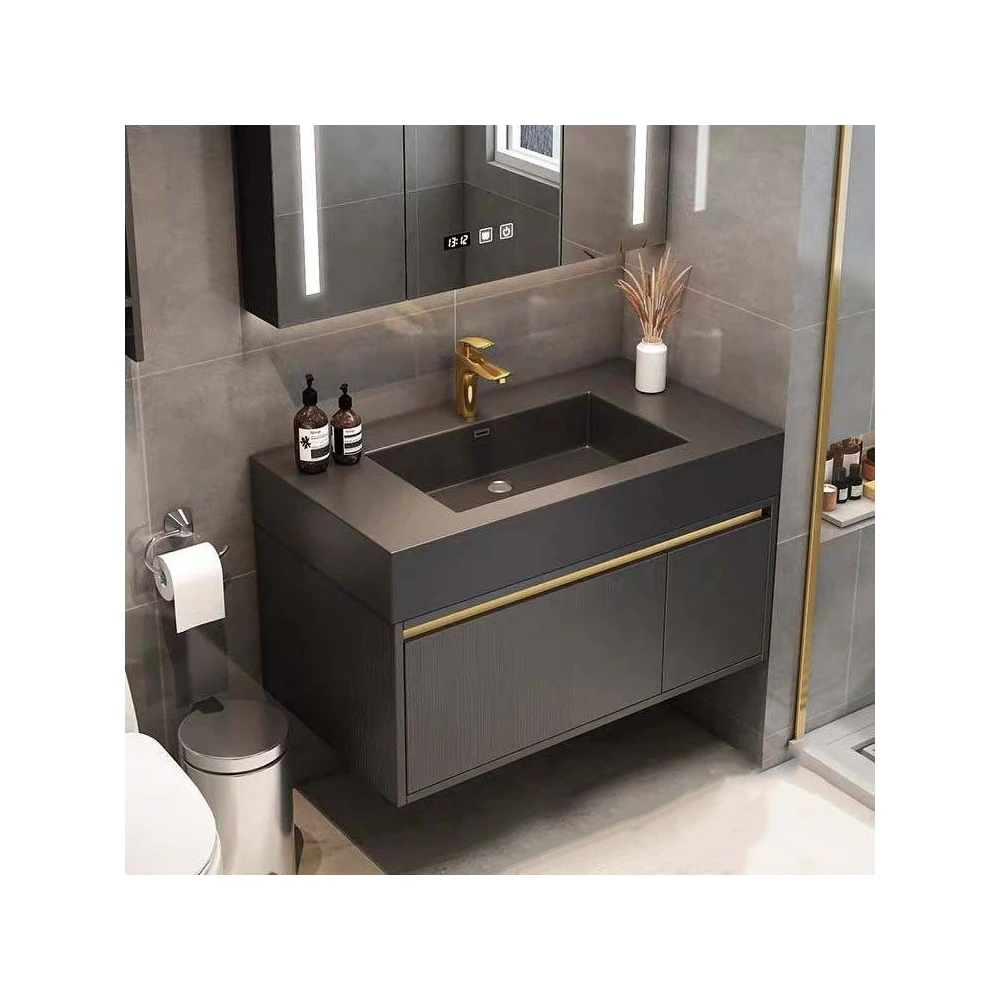 روشویی سرامیکی بلک مات با کابین و نوار طلایی
