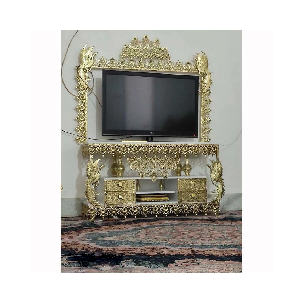 میز تلویزیون ۴ کشو، قاب دار بسیار زیبا و خاص، طرح طاووس با کیفیت اعلاء و روکش برنز
