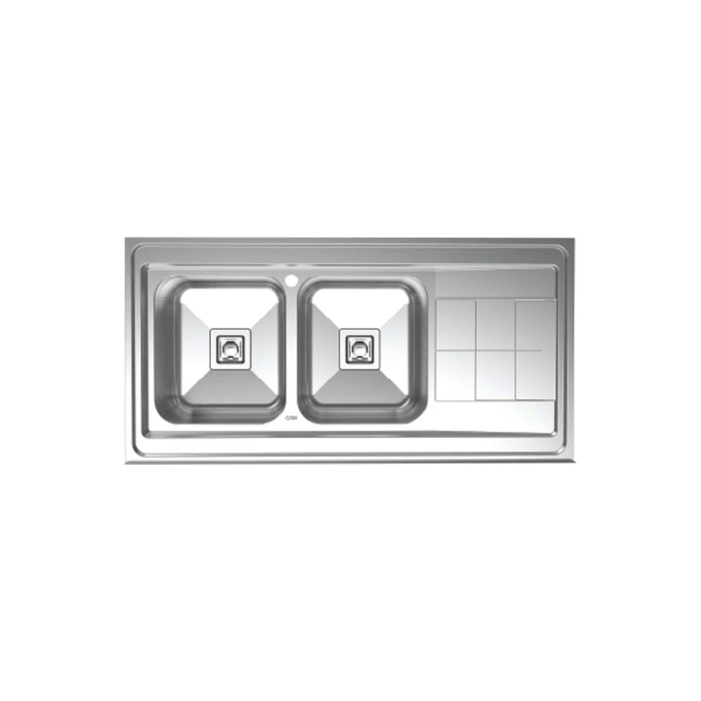 برند سینک:کن نوع سینک:توکار, هم سطح (Flush Mount) ابعاد سینک (cm):50*120 عمق سینک:23 سانتی متر نمای ظاهری سینک:استیل جنس سینک:استنلس استیل با ضخامت 1 میلی متر تعداد لگن سینک:2 وضعیت لگن سینک:لگن چپ, لگن راست
