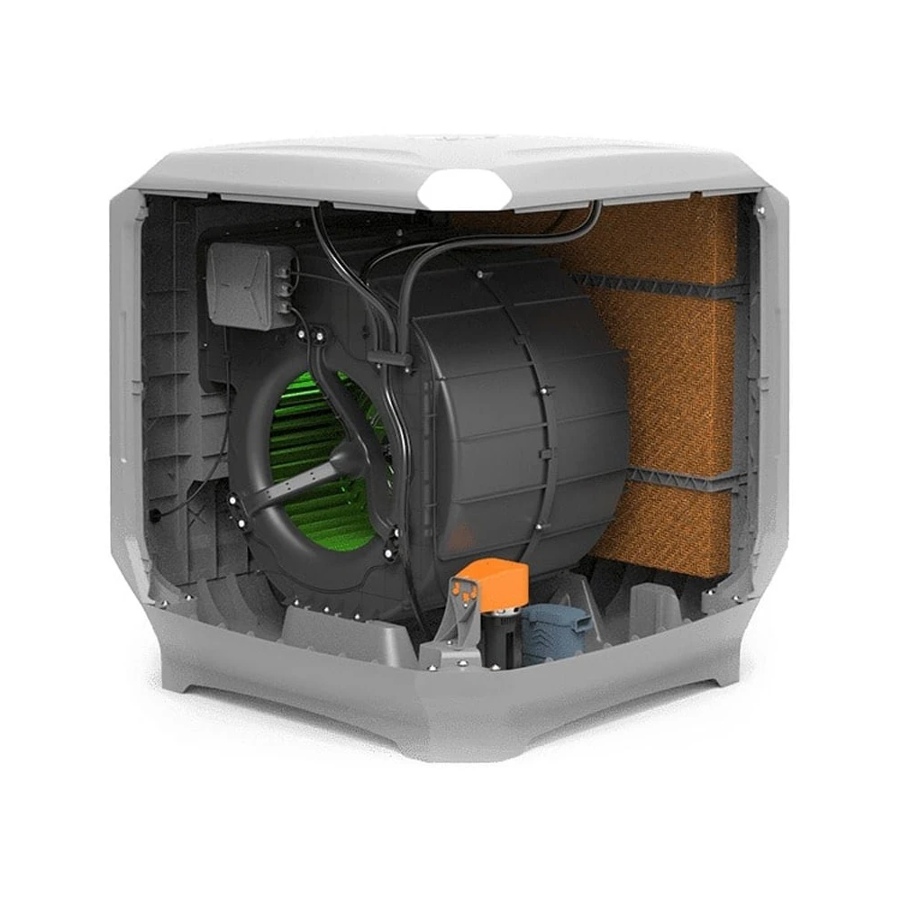 این کولر به جای پوشال، از پدهای سلولزی 10 سانتی‌متری استفاده می‌کند که هم قدرت جذب آب بالاتری دارند، هم خنک‌کنندگی یکنواخت‌تری ارائه می‌دهند. موتور 1 اسب بخار با مصرف برق 700 وات، عملکرد پرقدرتی با مصرف انرژی کم فراهم می‌کند.