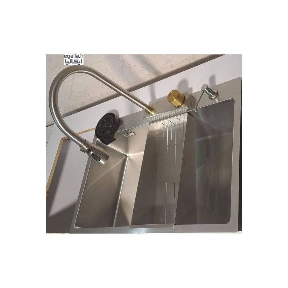 تجهیزات: شیرظرفشویی شلنگدار،شیر تصفیه،شیر آبشاری،لیوان شور،جامایعی،سیفون اتومات،سبد استیل،تخته سبزیجات،چراغ ال ای دی بدون نیاز به باطری،صفحه نمایشگر دمای آب بدون نیاز به برق و باطری...