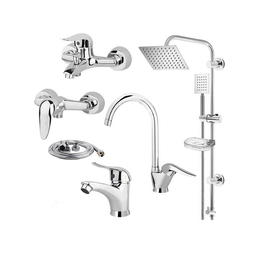 ست کامل شیرآلات مدل اکونومی 6 تکه با علم دوش و شلنگ توالت