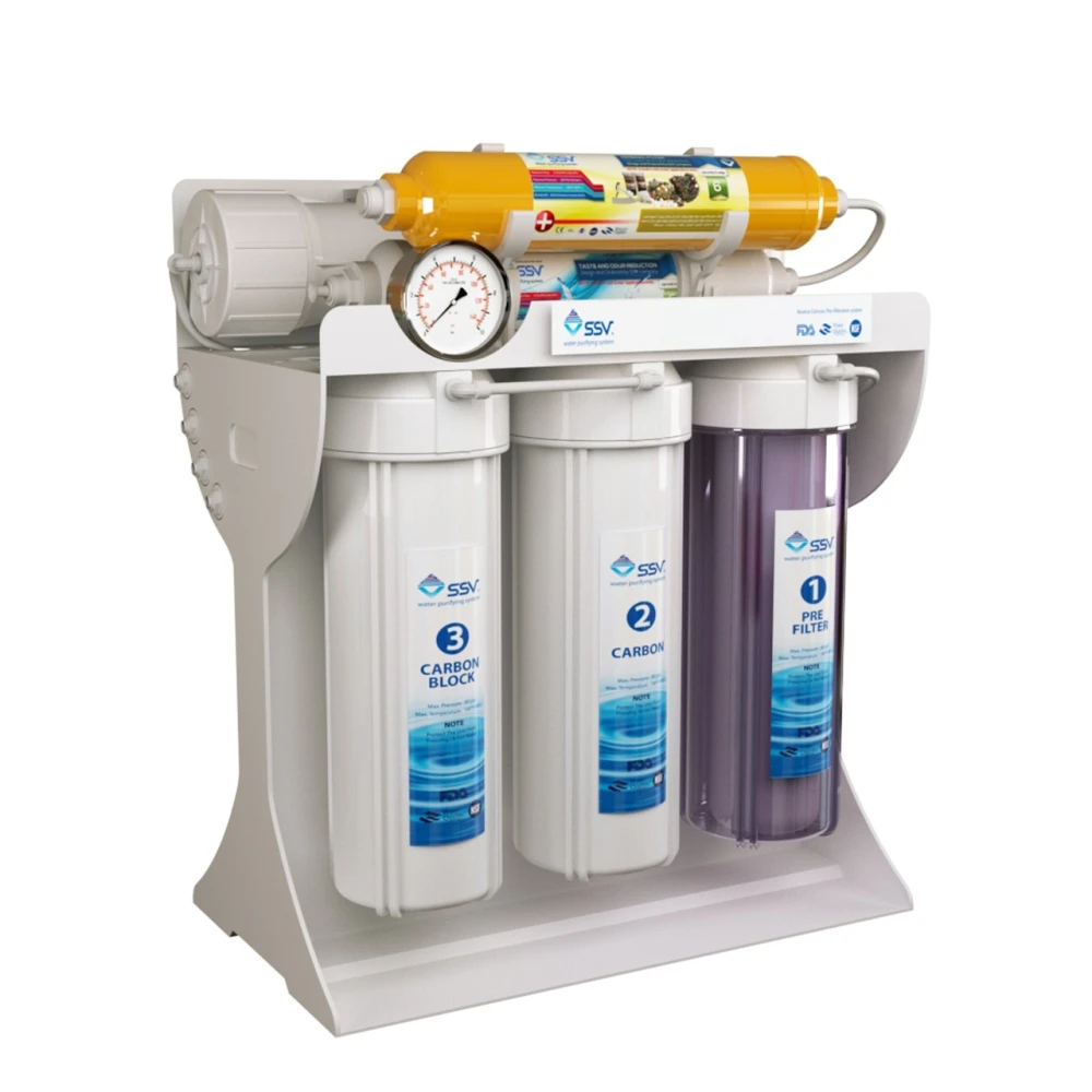 تصفیه آب SuperPro X محصولی کاملا جدید از سری تصفیه آب های SSV است که علاوه بر ظاهر زیبا و ابعاد کوچکش کیفیت آب تصفیه شده بالایی را ارائه میدهد. SSV این محصول را در دسته بندی دستگاه های معمولی قرار نمیدهد، چراکه با توجه به ویژگی هایی که دارد یک سر و گردن بالاتر قرار دارد. مدل رده بالای SuperPro به هوزینگ های دو اورینگ با گرید غذایی مجهز بوده، که این ویژگی موجب برتری این مدل نسبت به مدل MaxPro شده است. طراحی کمجا و بهینه دستگاه برای جایگیری و نصب در فضاهای کوچک مناسب است. استفاده از مخزن آنتی باکتریال، بوستر پمپ قوی (مگا بوستر)، فیلتر ممبران آمریکایی و تصفیه کامل وجه مشترک تمامی مدل های کمپانی SSV است. این محصول فیلترهای پلی پروپیلن، کربن اکتیو و کربن بلاک را در بخش پیش تصفیه، فیلترهای ممبران و پست کربن را در بخش تصفیه و فیلتر سوپرمینرال (جهت تنظیم املاح معدنی) را در بخش فرآوری در قلب خود جای داده است. پشتیبانی و خدمات پس از فروش گسترده در کشور و گارانتی معتبر موجب محبوبیت این برند نزد کاربران گردیده است. بهره گیری این کمپانی از قطعات یکپارچه و منحصر به فرد خود موجب شده تا SSV لیست بلند بالایی از بالاترین استانداردها و تاییدیه های جهانی همچون ISO، CE، WaterQuality، QAL ، NSF، SGS وEMP را در کارنامه خود ثبت کند و در چند سال اخیر پرچم دار دستگاه های تصفیه آب خانگی باشد.