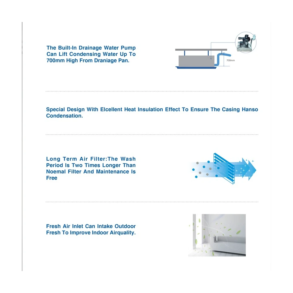 - مجهز به پمپ درین که می تواند آب تقطیر شده را تا ارتفاع 1200 میلی متر از سینی درین بالا بکشد.